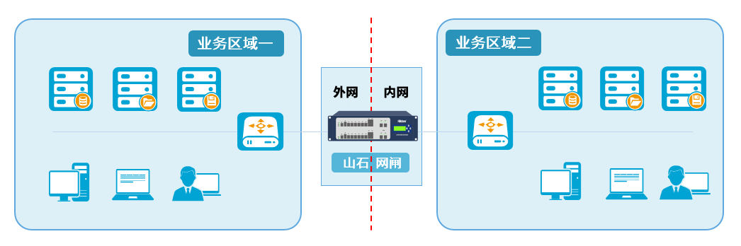 部署在两个不同的安全域网络之间,两个安全域分别连接产品的外网接口和内网接口,实现面向不同安全域或网络间的隔离与数据交换。