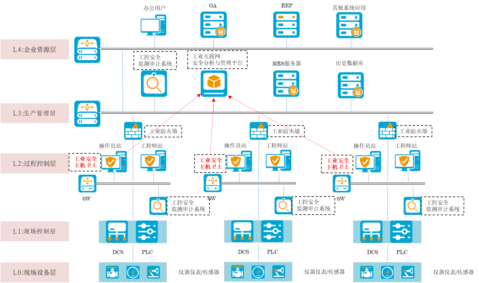 工业安全主机卫士部署于工业主机上面,如操作员站、工程师站及服务器站等,并与管理平台进行互通,接受统一纳管。系统典型部署如下: