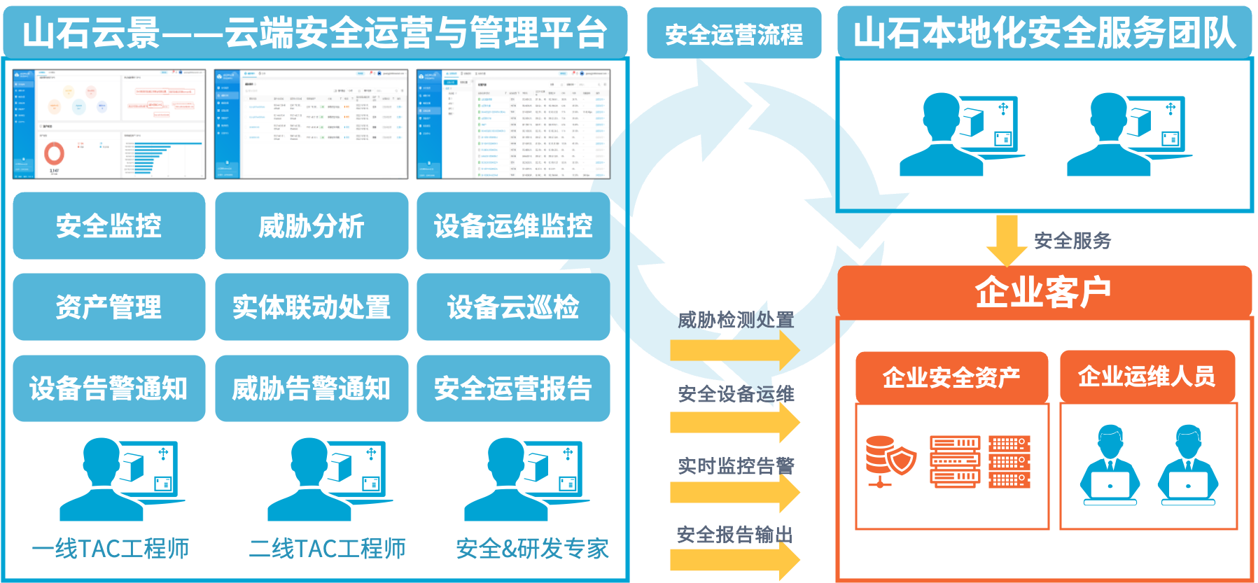 山石云景——云端安全运营与管理平台是山石安全运营体系中的云端支撑平台,是一款便捷、高效、高性价比的云端安全运营工具。用户可以通过Web端登陆平台,实时进行安全设备监控与运维、威胁发现与处置、资产管理与报表输出,实现在云端的一站式安全运营管理。