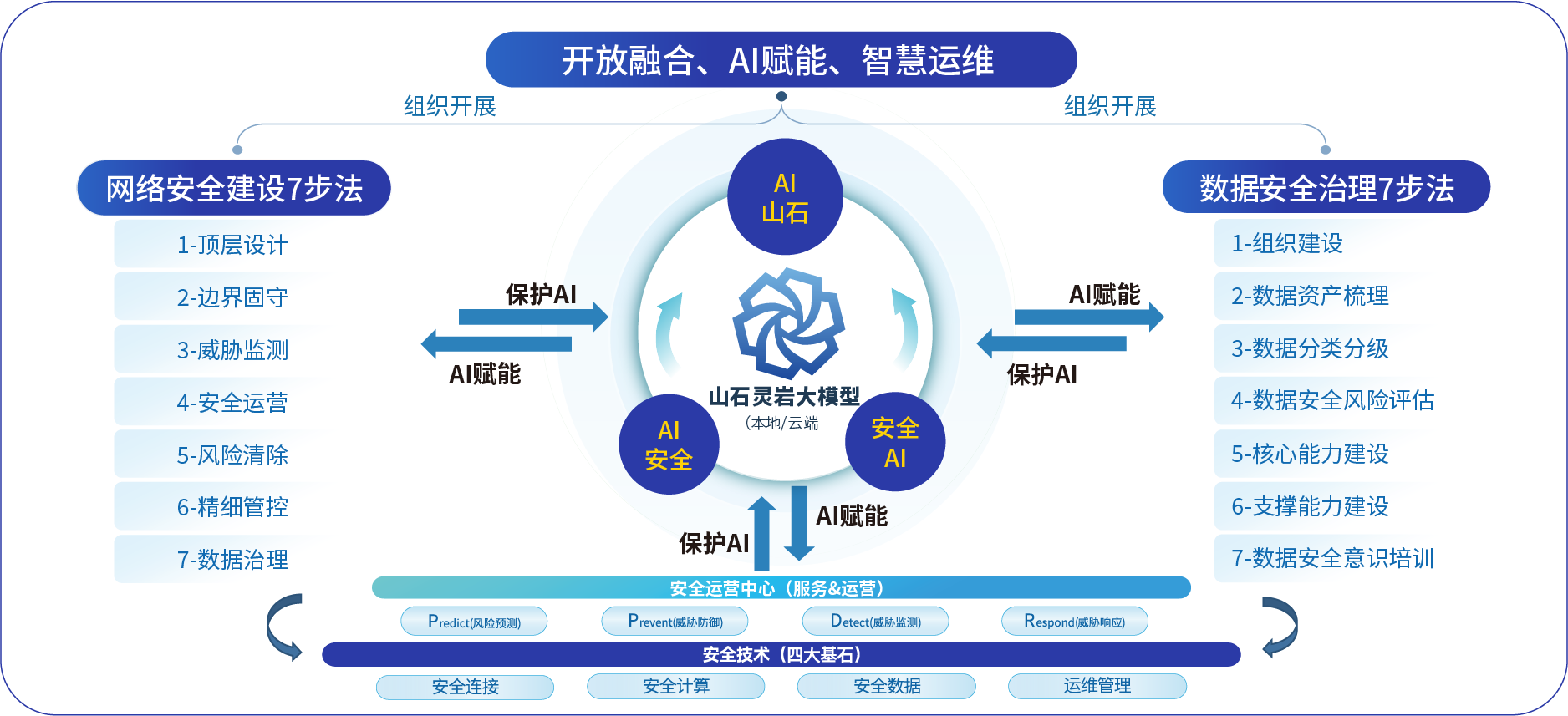 彩神购Vll购以山石灵岩大模型为核心,秉持“开放融合、AI赋能、智慧运维”的安全理念,遵循网络安全与数据安全治理7步法,通过“AI安全”与“安全 AI”双向驱动,有力支撑用户侧“一个中心、四大基石”安全能力与服务落地。此外利用 AI 技术,彩神购Vll购在各类场景实现多维度创新应用,通过“AI山石”为数字化转型提供智慧底座。