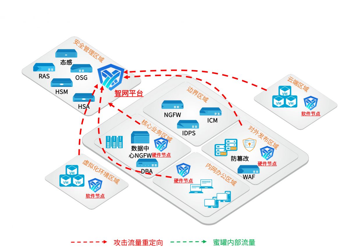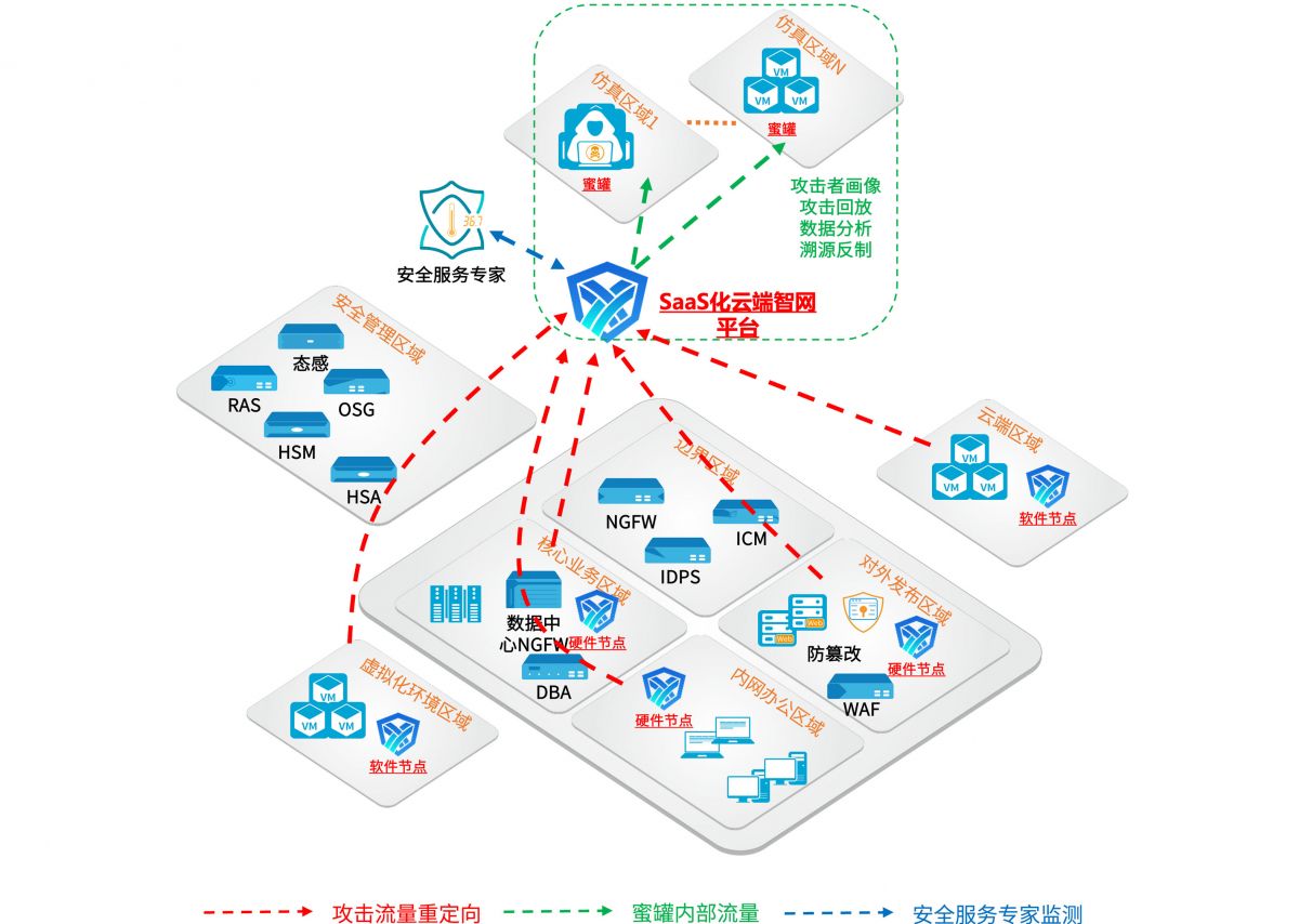 部署场景:探针节点部署在各个网络区域,攻击引流到智网平台/SaaS化云端智网平台