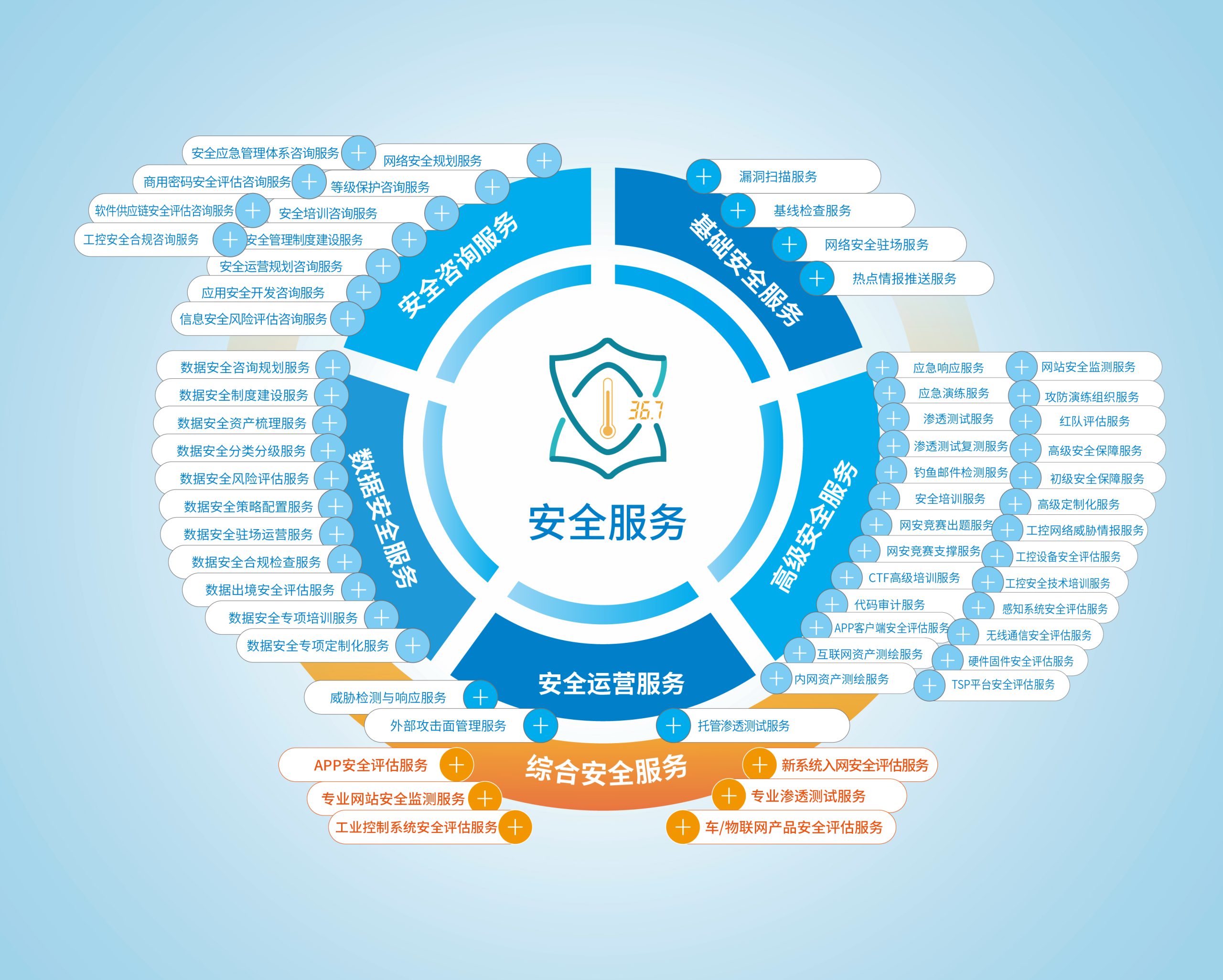 脆弱性管理:漏洞扫描服务、基线检查服务、托管渗透测试服务、渗透测试服务、渗透测试复测服务、新系统入网安全评估服务、红队评估服务、APP客户端安全评估服务、代码审计服务、车/物联网产品安全评估服务、工业控制系统安全评估服务