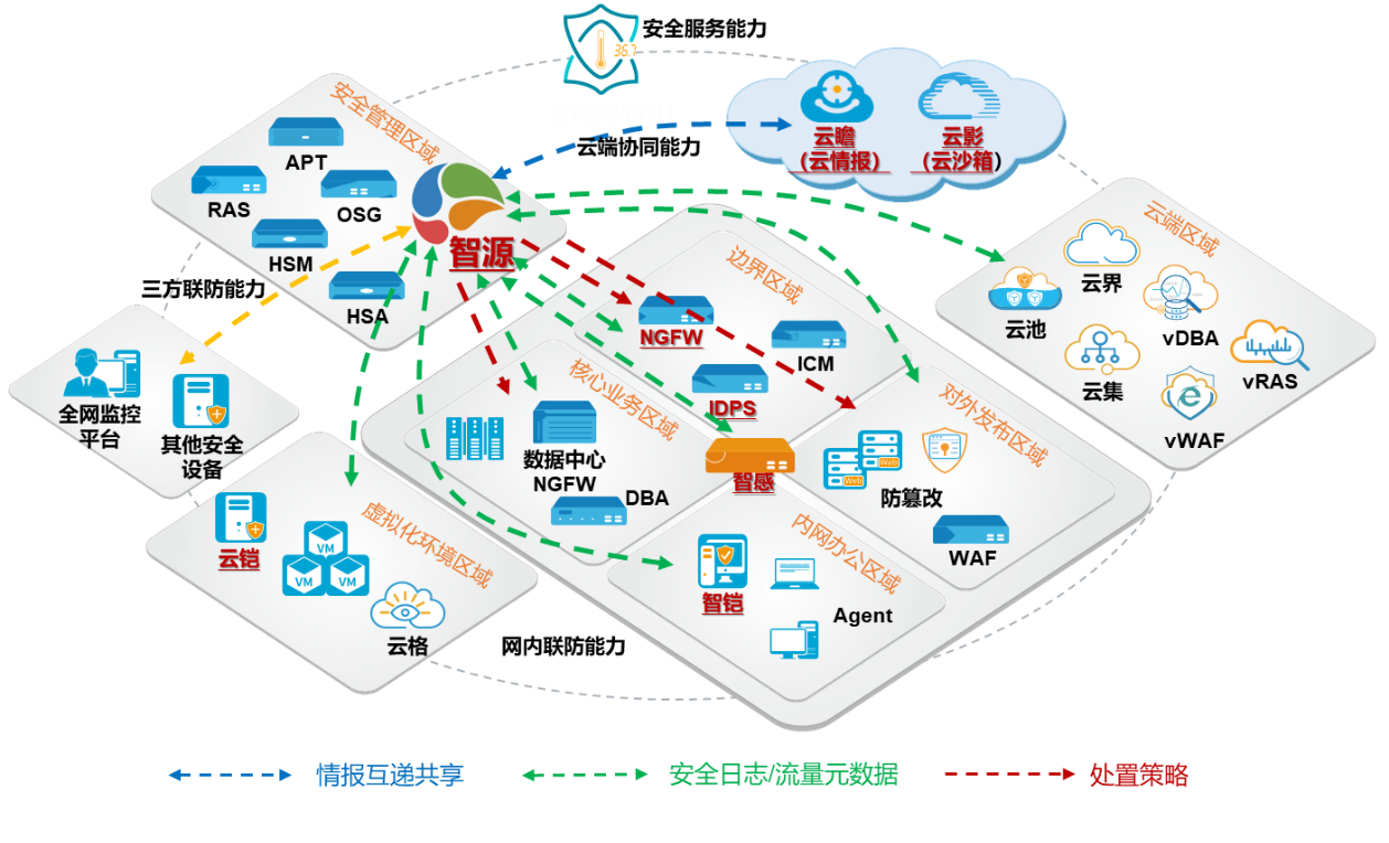 当前网络安全设备多数采用策略、特征库等静态方式判定已知威胁并加以处置,设备与设备间独立处置威胁且无法进行综合流量上下文分析,对于高危未知威胁缺乏监测、判定手段,往往在威胁发生后才能发觉,使得关键资产和核心业务处于威胁之下。