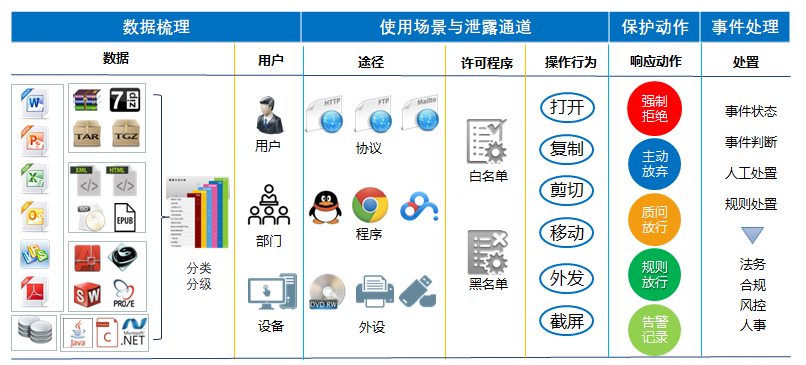 通过部署终端数据泄露防护客户端,系统可实现对敏感数据的以下操作进行监控和管控: