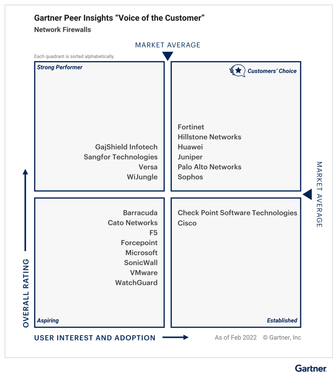 “Gartner® Peer Insights™是一个专门针对企业级软件的免费同行评审和评级平台。”客户可以根据使用经验对这些产品进行匿名评价,这些评论都经过严格的验证和审核,其结果可帮助企业管理者和决策者做出更正确的购买决策。此外,作为面向全球的点评平台,Peer Insights上的点评代表着全球客户对防火墙的多维度需求,更具参考价值。